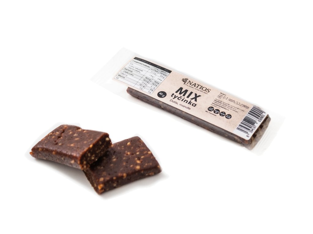 Baton Natios Mix o smaku daktyli i migdałów to idealna przekąska w podróży, podczas uprawiania sportu lub do szkoły. Zawsze, gdy najdzie Cię ochota na coś pysznego lub po prostu będziesz potrzebować uzupełnić energię, wystarczy odpakować i cieszyć się naturalnym składem oraz doskonałym smakiem. Baton nie jest dodatkowo dosładzany ani aromatyzowany, a mimo to ma przyjemnie słodki smak, dzięki czemu na pewno polubią go również dzieci. Nie zawiera żadnych sztucznych aromatów, substancji słodzących ani „E” dodatków.
