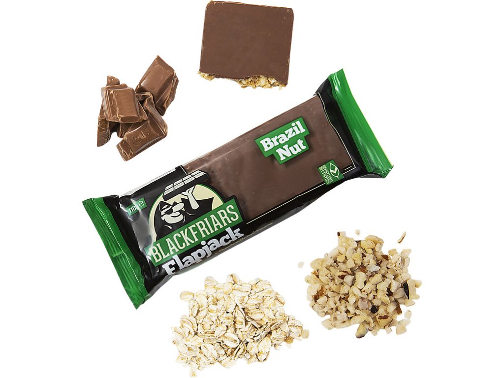 Flapjack Blackfriars z orzechami brazylijskimi i polewą czekoladową to porządny baton owsiany, który dzięki zawartości złożonych węglowodanów przyjemnie syci i dostarcza energii w ciągu dnia. Odpowiedni dla wegetarian.