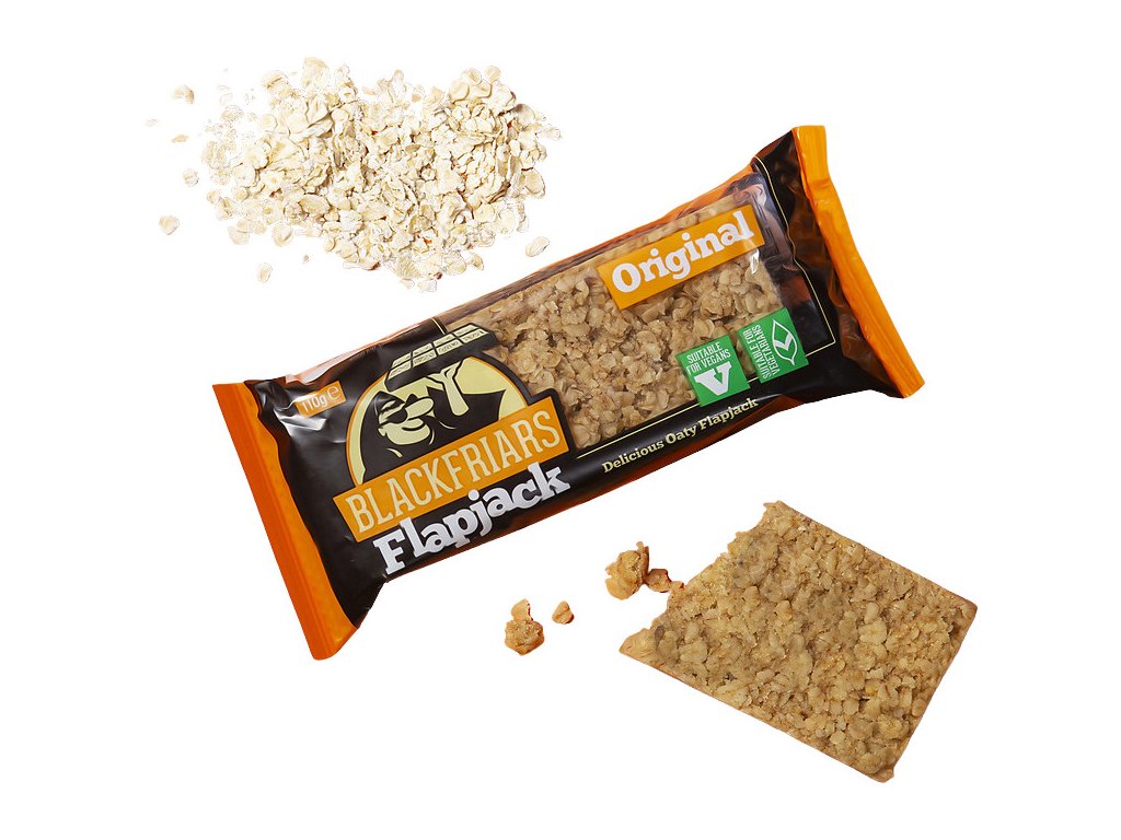 Flapjack Blackfriars z syropem i cukrem to uczciwy baton owsiany, który dzięki zawartości węglowodanów złożonych przyjemnie syci i dodaje energii w ciągu dnia. Odpowiedni dla wegetarian i wegan.