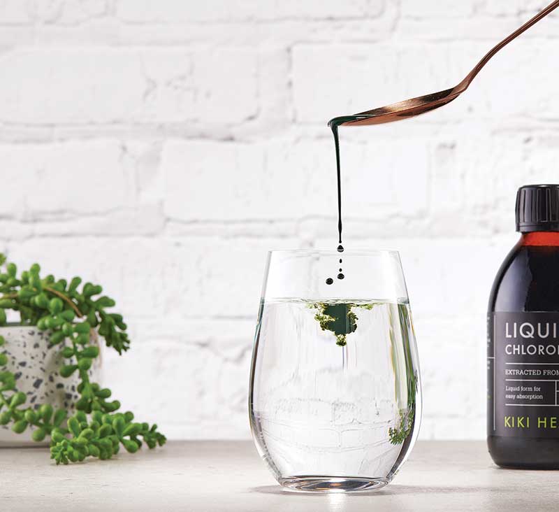 Chlorofil firmy Kiki Health występuje w postaci biodostępnego płynu i jest całkowicie naturalnym płynem roślinnym pochodzącym wyłącznie z trawy lucerny (alfalfa) bez konserwantów i sztucznych barwników, dzięki czemu ma żywy, naturalny smak.