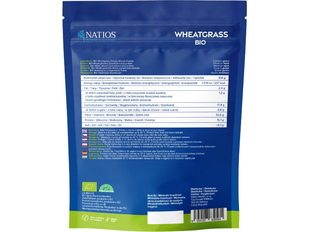 Składniki: BIO Młoda pszenica (trawa pszeniczna) proszek. GMO-free. Odpowiedni dla wegan. Zawiera gluten.