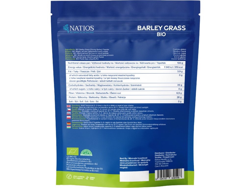 NATIOS łączy czystość natury z naciskiem na jakość. BIO Jęczmień pochodzi z certyfikowanego ekologicznego rolnictwa, co gwarantuje brak chemicznych nawozów i pestycydów. Efektem jest produkt, który szanuje swoje pochodzenie i dostarcza to, co najlepsze ze świata roślin – autentyczną siłę, bogactwo odżywcze i wsparcie zdrowia w każdej łyżeczce.
