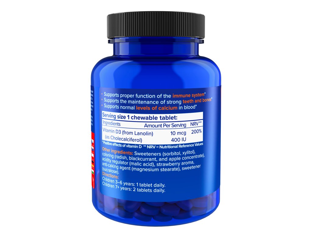 Łatwy sposób uzupełnienia witaminy D3 dla twoich dzieci, w dodatku bardzo smaczny. Uważaj, aby nie zjeść wszystkiego i zostawić coś dla dzieci! Te tabletki do żucia mają doskonały truskawkowy smak i są odpowiednie dla wszystkich dzieci już od 3 lat.
