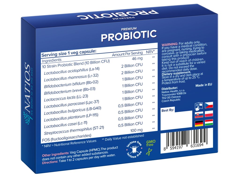 NATIOS Premium Probiotic, Probiotyki z FOS, 10 miliardów CFU, 10 szczepów, 60 kapsułek weg.