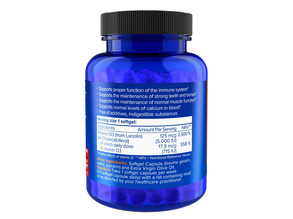 NATIOS Witamina D3, Wysoce przyswajalna, 5000 IU, 250 kapsułek softgel (z oliwą z oliwek)