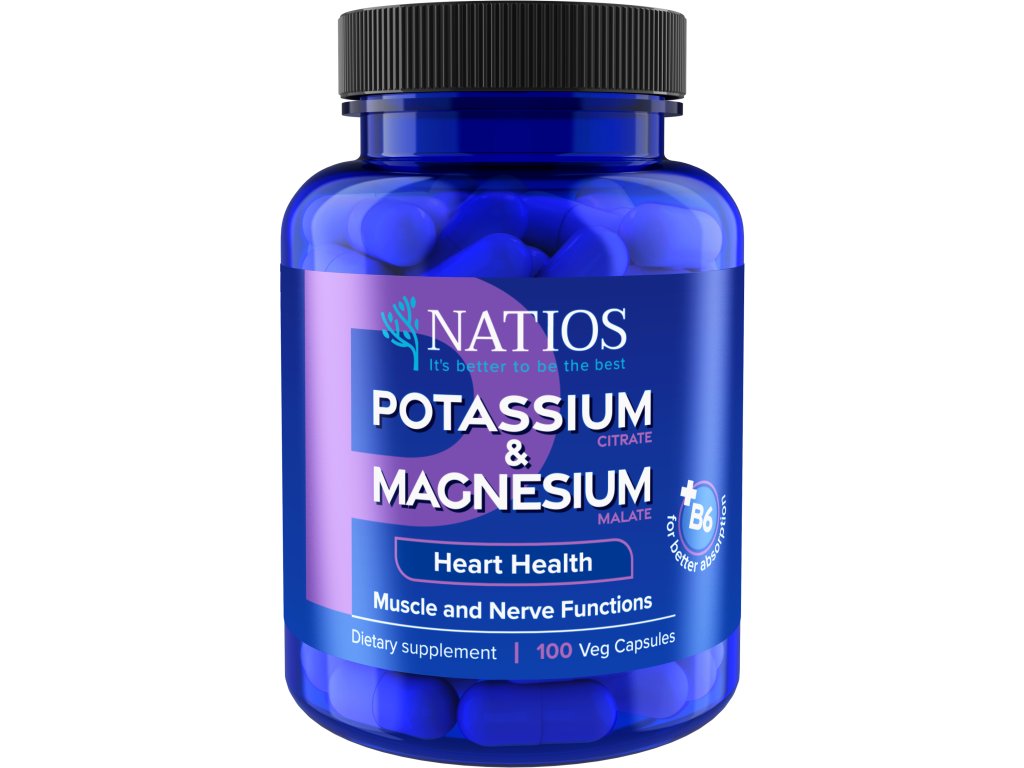 NATIOS Potassium & Magnesium (cytrynian potasu + jabłczan magnezu) – synergiczne połączenie dwóch minerałów, które uczestniczą w prawidłowej pracy mięśni, w tym serca. Pomaga utrzymać równowagę elektrolitową i prawidłowe funkcjonowanie mięśni.