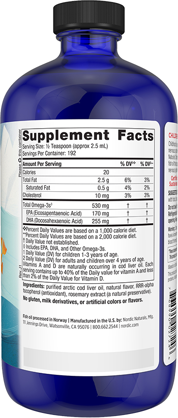 Olej rybny DHA dla dzieci jest wytwarzany wyłącznie z czystego oleju z wątroby dorsza arktycznego, który jest naturalnie zbilansowanym źródłem niezbędnych kwasów tłuszczowych omega-3 EPA i DHA. Każda porcja tego silnego oleju rybnego o smaku truskawkowym zawiera łącznie 530 mg kwasów tłuszczowych omega-3 i naturalnie zawiera witaminy A i D. Jedno opakowanie zawiera prawie 190 dawek. Odpowiedni dla dzieci od 12 miesiąca życia.