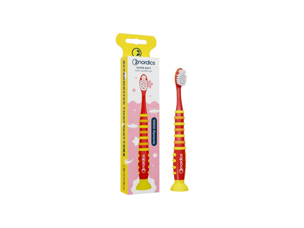 Nordics Szczoteczka dla dzieci, Super miękka, 10500 włókien – Czerwono-żółta rakieta, od 4 lat