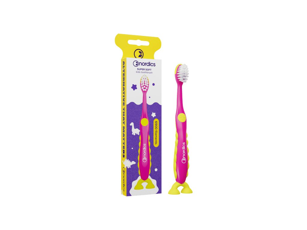 Nordics Szczoteczka dla dzieci, super miękka, 6900 włókien – różowo-żółty dinozaur, od 2. roku życia
