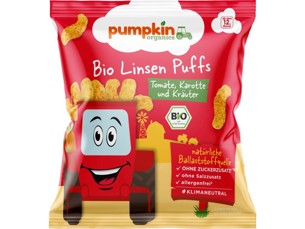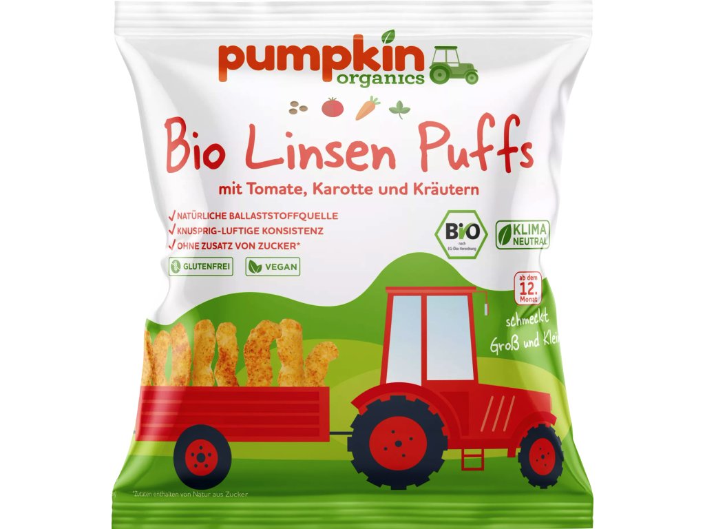 Pumpkin Organics BIO Chrupki dmuchane 20 g - Z soczewicy z pomidorami, marchewką i ziołami (od 12. miesiąca)