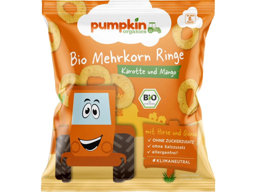 Pumpkin Organics BIO Dmuchane chrupki 20 g – Wielozbożowe kółeczka z marchewki i mango (8. miesiąc)