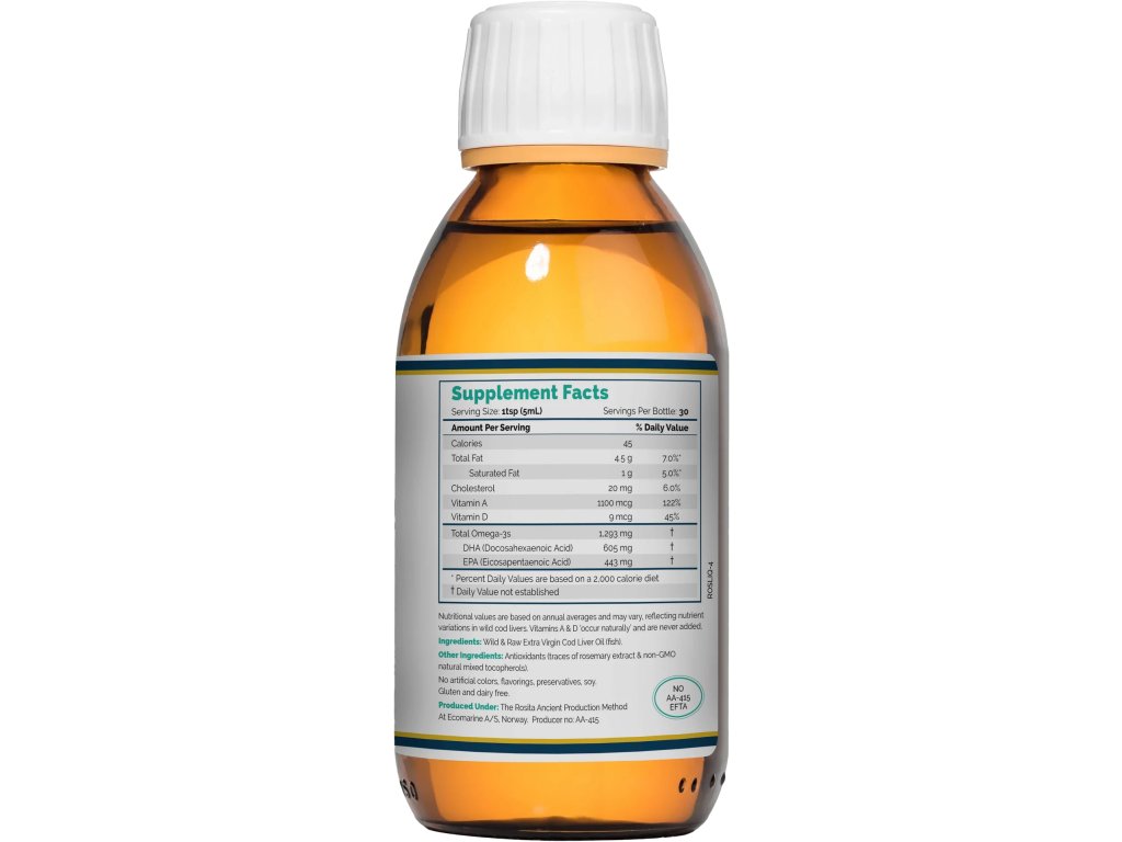 Rosita Extra Virgin Cod Liver Oil to jeden z niewielu świeżych, surowych olejów z wątroby dorsza z dzikiego połowu na świecie. Pochodzi prosto z nieskazitelnie czystych norweskich mórz, w których łowili starożytni Wikingowie. Zawiera naturalnie występujące witaminy A i D oraz pełne spektrum kwasów tłuszczowych omega, w tym omega-3 EPA i DHA.