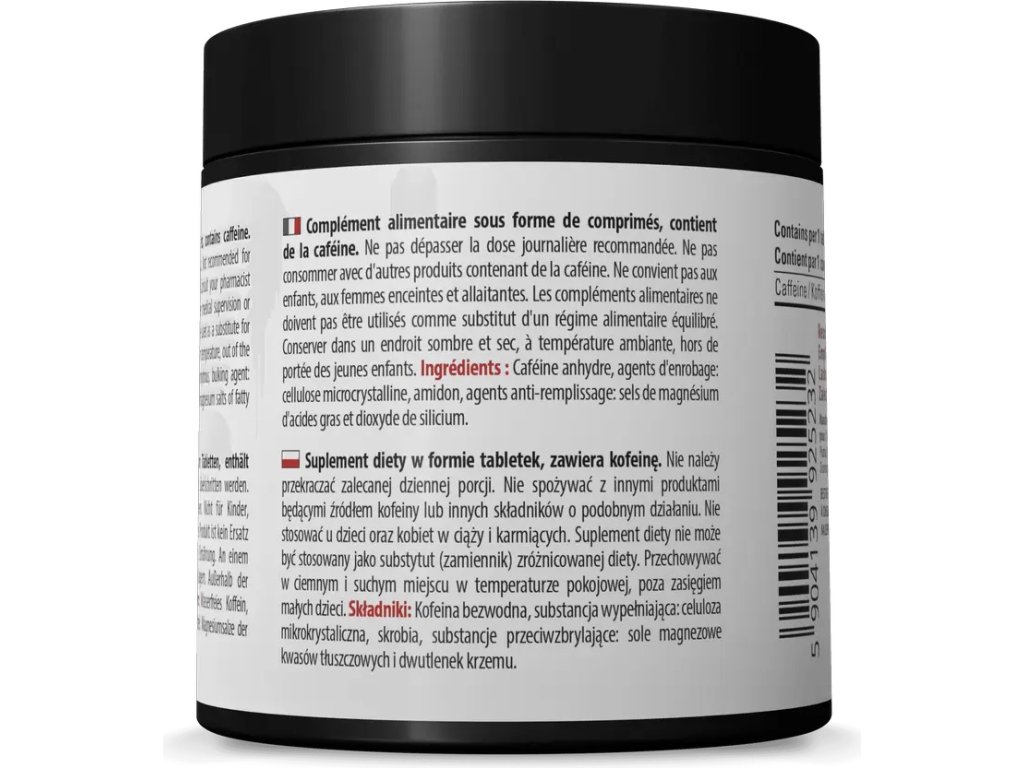 Każda tabletka zawiera 200 mg czystej bezwodnej kofeiny, czyli formy kofeiny o wysokiej biodostępności, która szybko się wchłania i skutecznie stymuluje ośrodkowy układ nerwowy. Badania naukowe potwierdzają, że kofeina pomaga zwiększyć wytrzymałość fizyczną, poprawia koncentrację i zmniejsza subiektywne uczucie zmęczenia, co czyni ją idealnym suplementem przed treningiem, ważnym wyzwaniem zawodowym lub podczas intensywnej nauki.