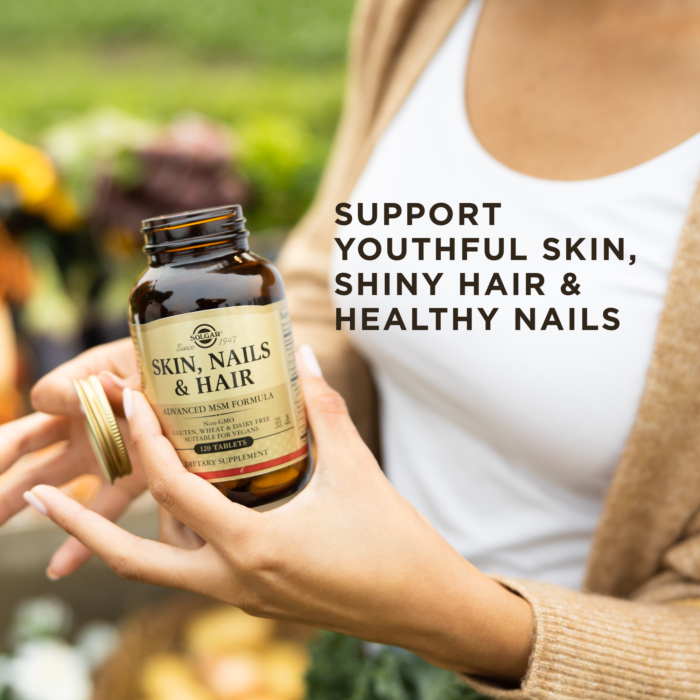 Kompleks 7 aktywnych składników dla zdrowej skóry, paznokci i włosów. Złe nawyki związane ze stylem życia, genetyka i ekspozycja na promieniowanie UV mogą powodować przedwczesne starzenie się skóry. Produkcja kolagenu i keratyny również stopniowo spowalnia wraz z wiekiem. Czynniki te mogą sprawić, że skóra będzie bardziej podatna na zmarszczki. Dlatego Solgar Skin, Nails & Hair jest tutaj, aby pomóc zachować naturalne piękno i odżywić skórę od wewnątrz.