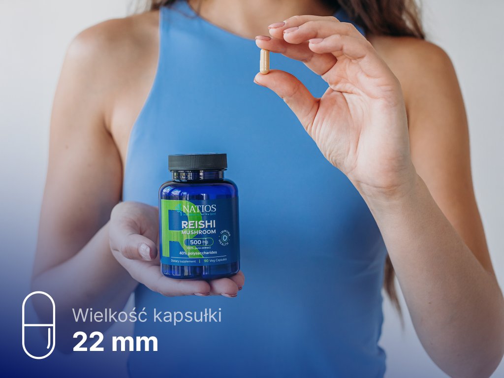 Ten suplement Reishi marki Natios zawiera bardzo silny ekstrakt z owocników. Głównymi substancjami aktywnymi grzybów Reishi są polisacharydy (zwłaszcza beta 1-3-D-glukany). Każda wegańska kapsułka zawiera 500 mg czystego i silnego ekstraktu, który jest standaryzowany na 40% polisacharydów. Oznacza to, że ekstrakt ten jest do 40 razy bardziej skoncentrowany i skuteczny niż surowy proszek ze zmielonych grzybów Reishi. Dzięki tej sile w zupełności wystarczy przyjmować tylko 1 kapsułkę dziennie.